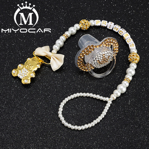 MIYOCAR any name Elegant luxury bling bear pacifier clip holder pacifier holder with bling gold crown bling pacifier SP016